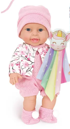 Esta linda boneca vem com uma naninha em formato de unicórnio e um mordedor especial.