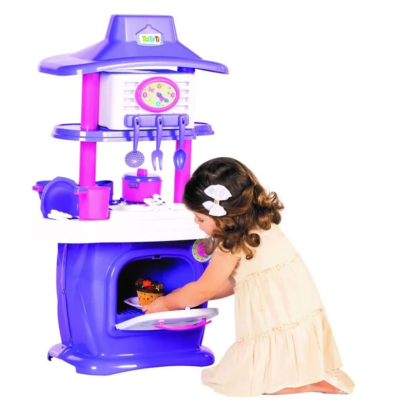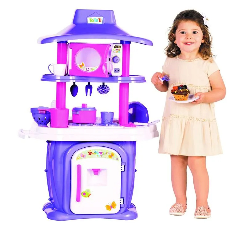 Cozinha completa com dois lados para brincar! De um lado uma geladeira com dispenser de água na porta que funciona de verdade, fogão e um forno de micro-ondas com som! Do outro, um forninho e uma pia que vem com uma torneira que sai água! Nela dá para lavar os pratinhos, talheres, copos e panelinhas que vem junto com a Le Grand Chef!