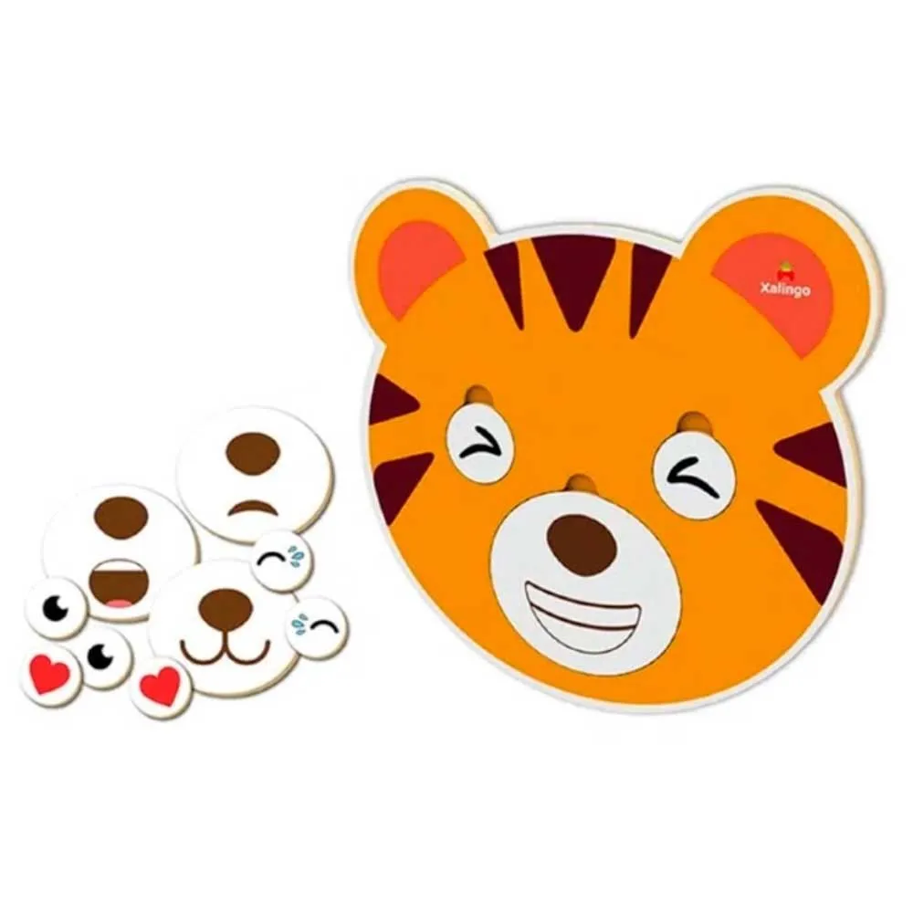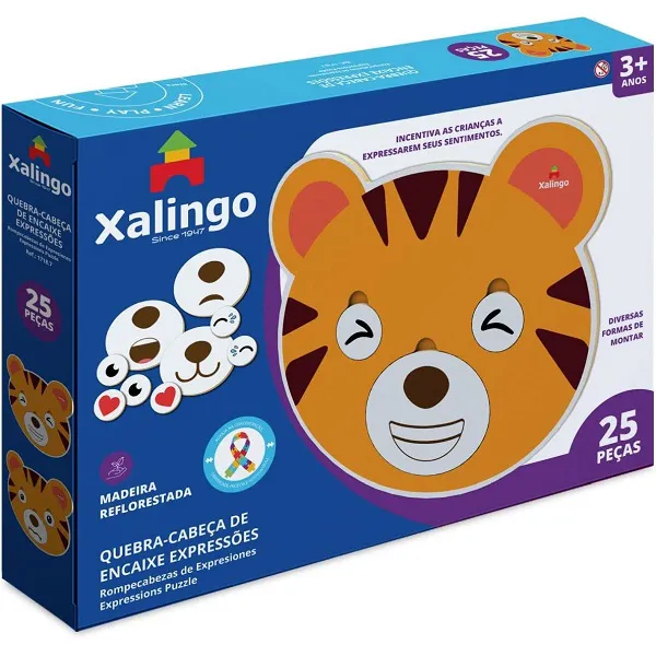 Modo de brincar: Com o auxílio da base de quebra-cabeças em formato de tigre, a criança deve posicionar as peças nas silhuetas de contorno correspondente, formando diversas expressões para o personagem. Através da brincadeira a criança pode expressar o que está sentindo, possibilitando aos pais e responsáveis compreenderem melhor os sentimentos dos pequenos.