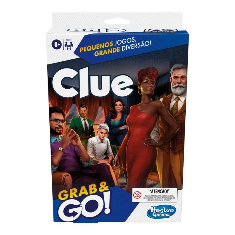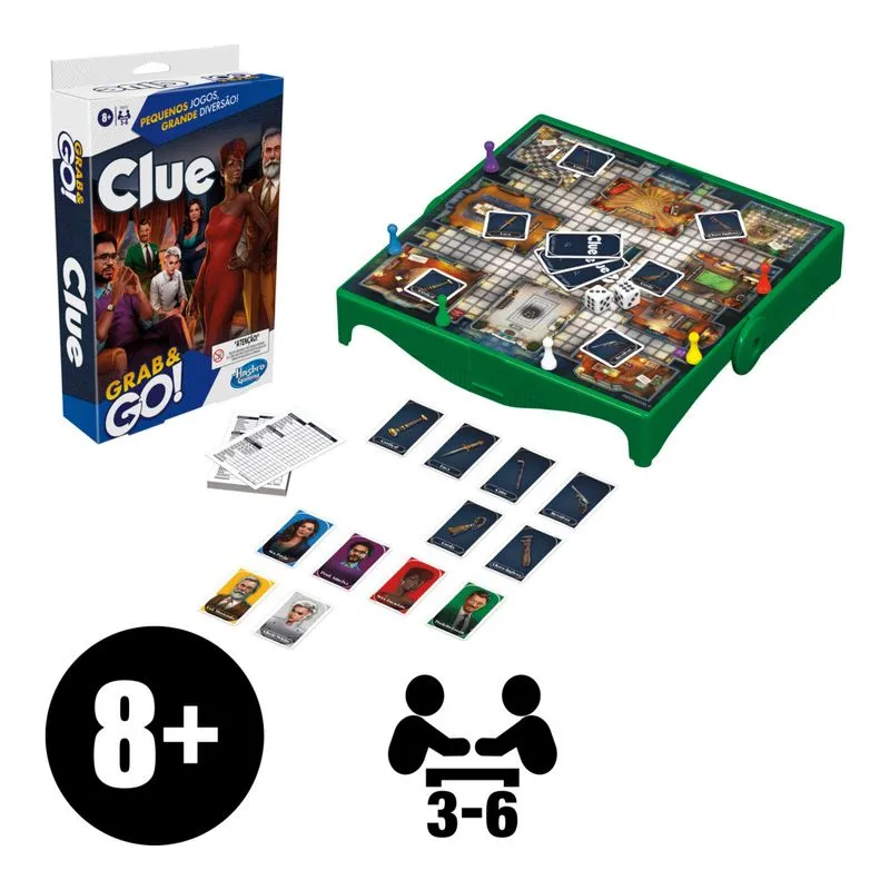 VERSÃO PORTÁTIL DO CLUEDO. A jogabilidade clássica em formato de bolso. Esta versão do Cluedo para jogadores a partir dos 8 anos é portátil para se jogar em qualquer lado; JOGO DE VIAGEM DIVERTIDO PARA CRIANÇAS. O jogo Cluedo Grab & Go para 3 a 6 jogadores é uma excelente opção para passar o tempo em viagens de avião, comboio ou carro, bem como em acampamentos e nas férias; FÁCIL DE GUARDAR. Depois de se diverirem numa noite de jogos com a família em qualquer lugar, as crianças podem guardar todas as peças no estojo; UM MISTÉRIO PARA RESOLVER. Assim como no jogo Cluedo normal, os jogadores usam cartas e o bloco de detetive para tentar desvendar o mistério. O jogador que fizer uma acusação correta é o vencedor; PRESENTE PORTÁTIL. Este jogo é um ótimo presente para crianças e adultos, além de ser excelente como brinde de festa ou pequeno presente de Natal ou Páscoa. Há um mistério por resolver! O jogo Cluedo Grab & Go para 3 a 6 jogadores é uma excelente opção para passar o tempo em viagens de avião, comboio ou carro, bem como em acampamentos e nas férias. Quem assassinou o anfitrião? Onde e com que arma?