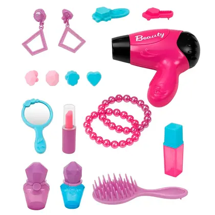 - Contém: 01 Maleta, 02 Espelhos, 01 Secador, 01 Pente, 01 Batom, 02 Pulseira, 04 Anéis, 02 Presilhas, 03 Frascos de Perfume, 02 Brincos
